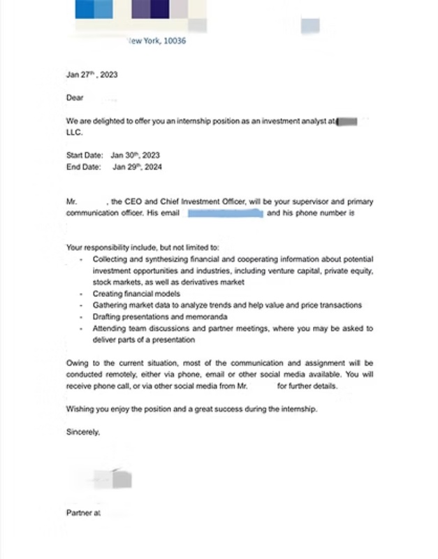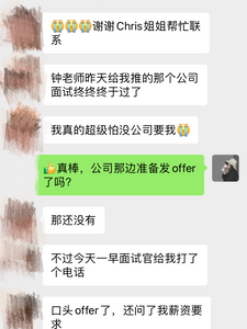 S同学是朋友推荐找到我们的,他的OPT 1/15开始,在进入失业期前开始准备,1/27拿到ny老牌pe公司的Investment Analyst offer! S同学的背景是今年哥大金融master的ng,身在纽约,希望能够融入到这个世界金融中心。我们在和他的整个对接过程中,都能感受到他是一个谦卑有礼貌,非常配合我们的一个好孩子。企业端也尽心尽力推进我们的华尔街资源(是的,我们不止硅谷tech资源🤝),最终拿到这个offer,是我们共同努力的结果,感谢他和朋友的信任,也祝越来越好。